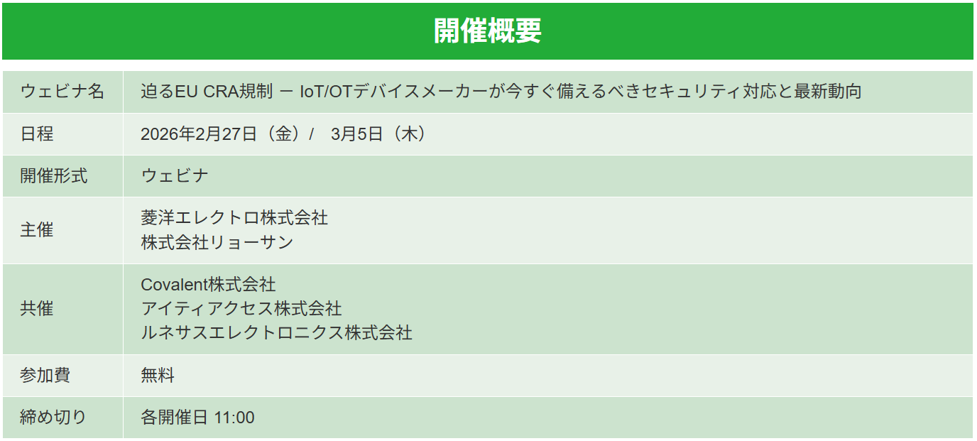 弊社は、菱洋エレクトロ株式会社/株式会社リョーサンが主催するオンライン・イベント迫るEU CRA規制 - IoT/OTデバイスメーカーが今すぐ備えるべきセキュリティ対応と最新動向にて登壇いたします。